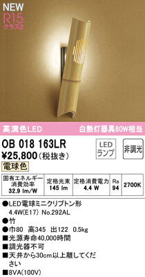 ●商品の関連商品や機能説明などPC用ページに切り替えてご確認下さい 下記リンクから移動出来ます↓↓↓↓↓↓ [ 人気 商品 検索 画面 はこちらから ] ●関連商品 和風 照明 ブラケットライトOB125031LD ガラス(乳白)、真鍮・銅飾付 白熱灯60W相当33,049円和風 照明 ブラケットライトOB125031LC ガラス(乳白)、真鍮・銅飾付 調光・白熱灯60W相当33,303円和風 照明 ブラケットライトOB125031PC ガラス(乳白)、真鍮・銅飾付 調光・光色切替・白熱灯60W相当33,557円和風 照明 ブラケットライトOB125031BC ガラス(乳白)、真鍮・銅飾付 Bluetooth対応機種 調光調色・白熱灯60W相当34,067円和風 照明 ブラケットライトOB018100LD 竹・アクリル(乳白) 白熱灯50W相当12,551円 和風 照明 ブラケットライトOB018100LC 竹・アクリル(乳白) 調光・白熱灯50W相当12,804円和風 照明 ブラケットライトOB018100PC 竹・アクリル(乳白) 調光・光色切替・白熱灯50W相当13,057円和風 照明 ブラケットライトOB018100BC 竹・アクリル(乳白) Bluetooth対応機種 調光調色・白熱灯50W相当13,563円和風 照明 ブラケットライトOB018163LD 竹 白熱灯60W相当13,117円和風 照明 ブラケットライトOB018163LC 竹 調光・白熱灯60W相当13,371円 和風 照明 ブラケットライトOB018163PC 竹 調光・光色切替・白熱灯60W相当13,625円