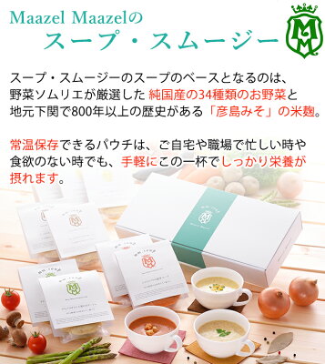 商品詳細 商品名 34種のやさい畑スープスムージー5種(蓮根とほうれん草、蓮根とゆず、とうもろこし、エビとトマト、たっぷりキノコ) 8個入りギフト【エムエム・スープ】【国産34種類の野菜と米麹入】Maazel Maazel(マーゼルマーゼル) 商品説明 食べるスープスムージー5種類8袋入りのギフトセットです。