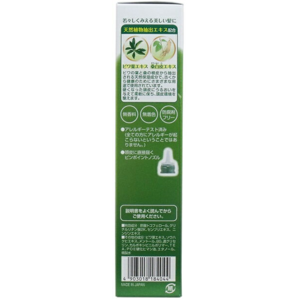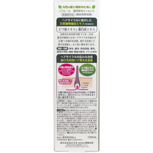 商品特徴一覧haircare、ikumou、4903018、4903018184044、通信販売、通販、販売、買う、購入、お店、売っている、ショッピング【リフルール ビワ葉と桑白皮 薬用育毛エッセンス 120mL】広告文責(有)イースクエアTEL:0120-532-772株式会社柳屋本店個装サイズ:52X175X40mm個装重量:約180g内容量:120mL製造国:日本【発売元:柳屋本店】【医薬部外品】【効能・効果】育毛、養毛、発毛促進、薄毛、脱毛の予防、病後・産後の脱毛、フケ、かゆみ【成分】[有効成分]酢酸トコフェロール、グリチルリチン酸2K、センブリエキス、ニンジンエキス[その他の成分]ビワ葉エキス、ソウハクエキス、メントール、BG、濃グリセリン、カルボキシビニルポリマー、TEA、POE硬化ヒマシ油、エタノール、精製水【使用方法】・頭皮にノズル先端を当てて適量を塗布し、指の腹で頭皮を持ち上げるようにやさしくマッサージします。