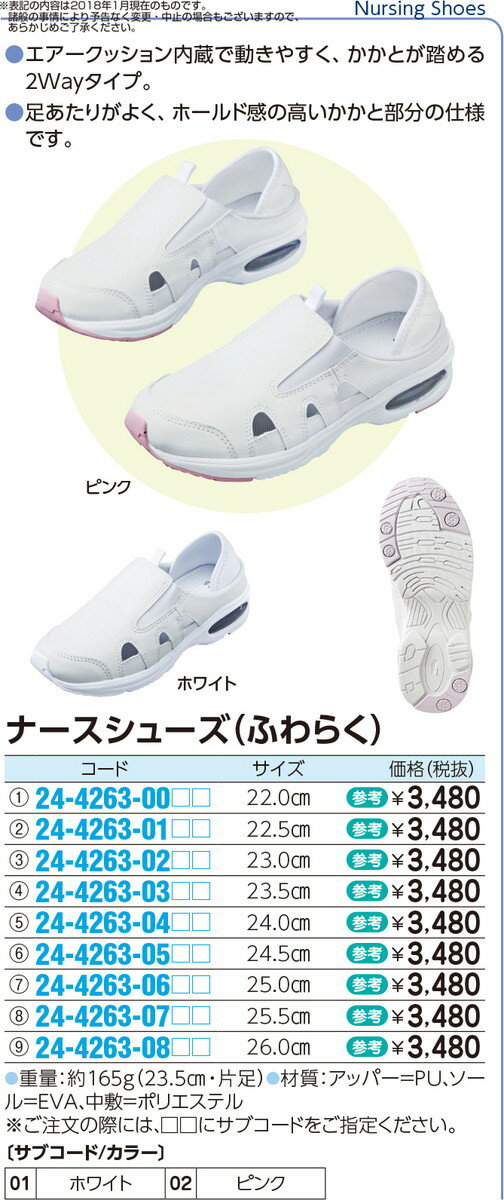 ナースシューズ(ふわらく) 25.0CM品番 24-4263-06021入り 医療機器対象外 ウェア・ナースグッズ シューズ 定価\3480 JAN ●定価¥3,480円(税別)●商品説明●エアークッション内蔵で動きやすく、かかとが踏める2Wayタイプ。